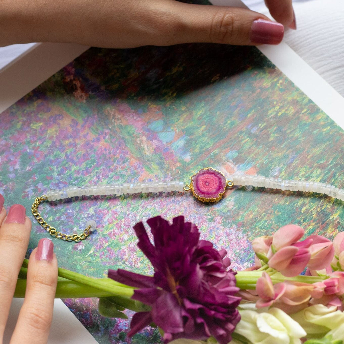 Crafted with meticulous artistry, the bracelet features a delicate string of rainbow moonstone beads, each one possessing a mesmerizing iridescence that dances with the light. At the heart of this enchanting creation rests a regal purple solar quartz, capturing the mystery and allure of twilight's hues.