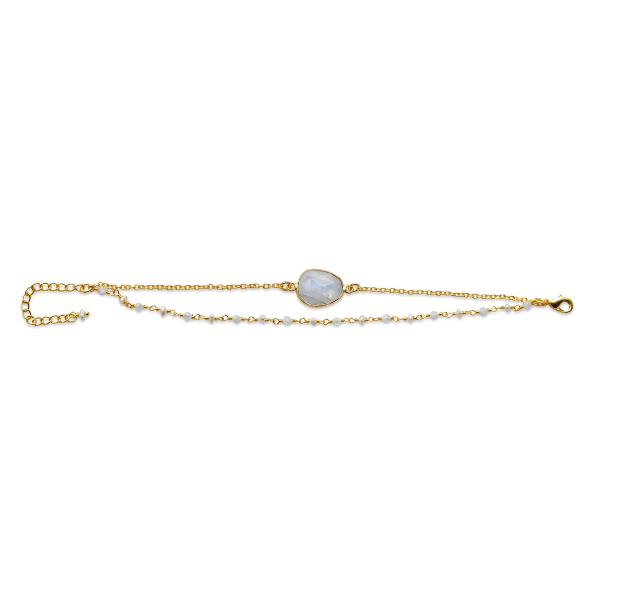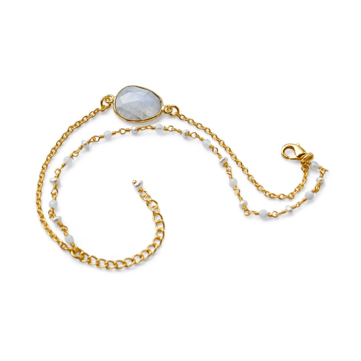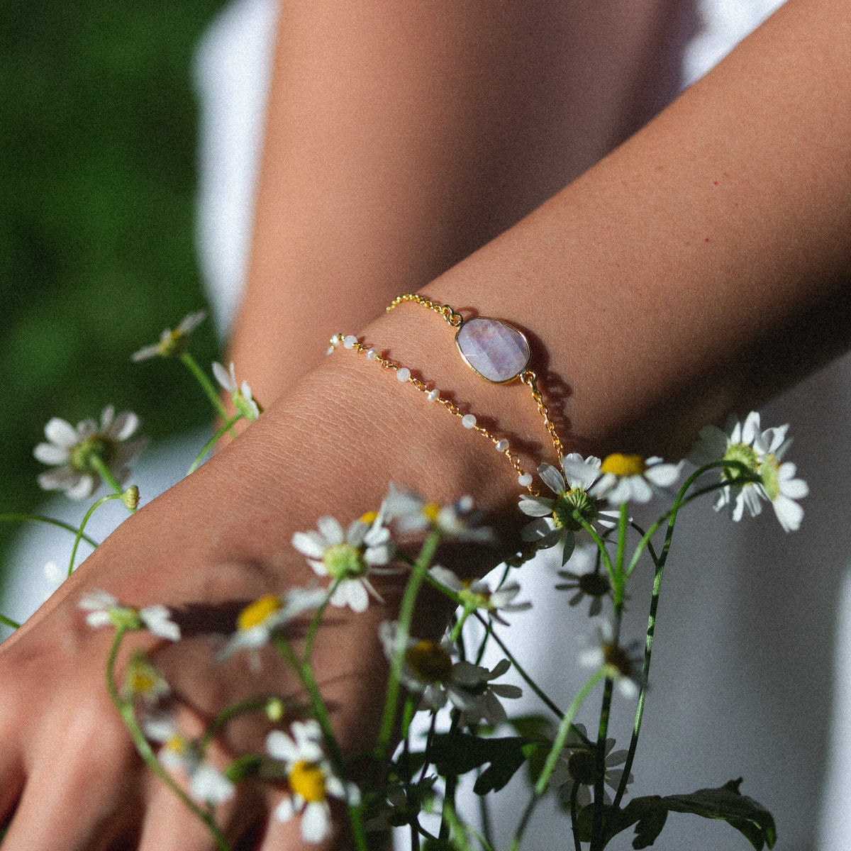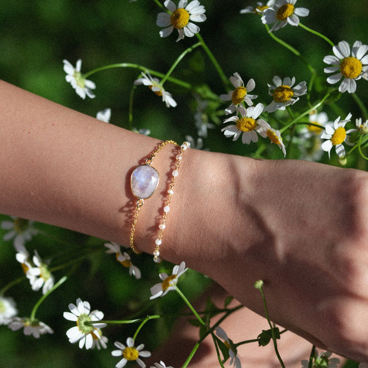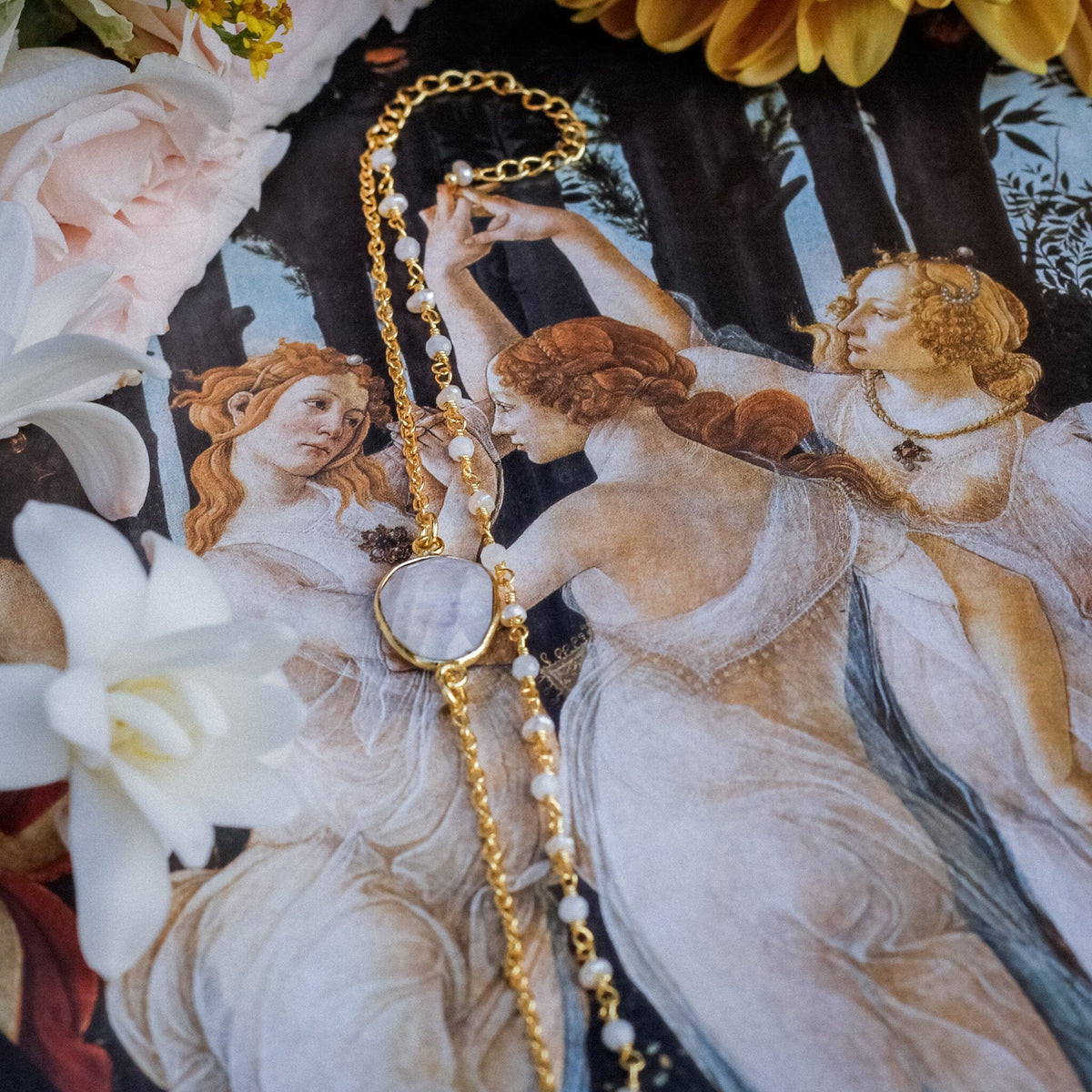 The Primavera Bracelet, a captivating piece from our Botticelli Collection, is inspired by Botticelli's "La Primavera." This intricate bracelet features two delicate strands—the first adorned with intercalated tiny natural pearls and Moonstones, and the second chain showcasing a single central Rainbow Moonstone.