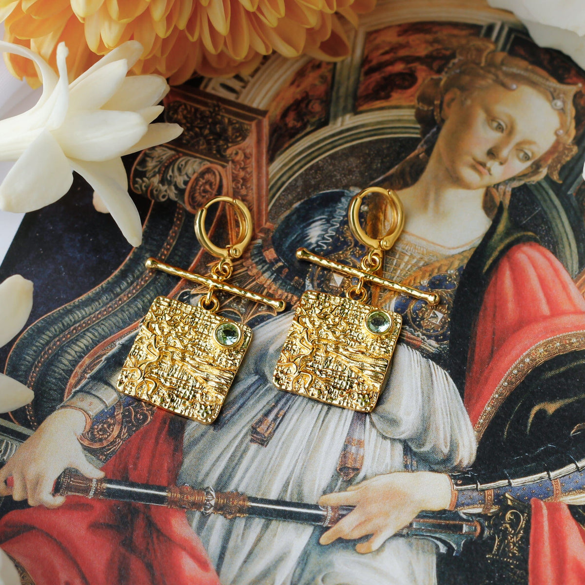The light earrings feature a delicate hoop design, from which a rectangular charm dangles gracefully. This charm, adorned with textured gold ripples, echoes the flowing robes of the central figure in the painting and is accentuated by a green Amethyst Quartz, a gentle nod to the natural world's enduring beauty.