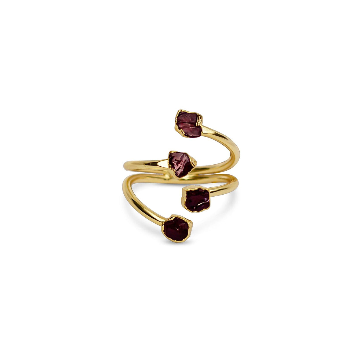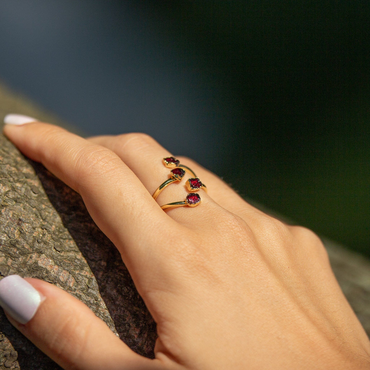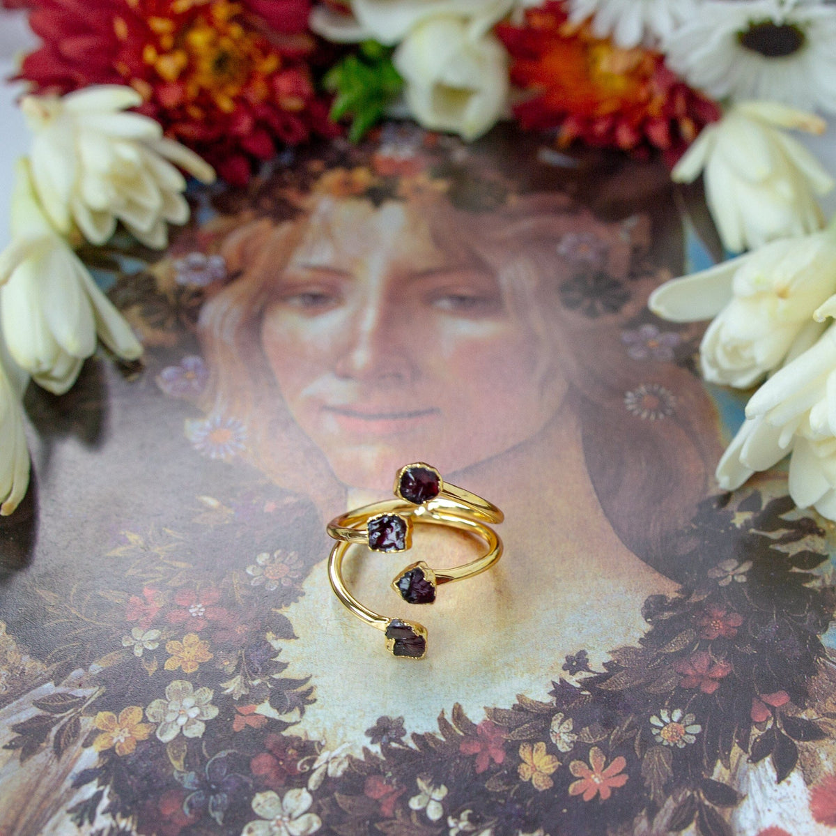 The Flora Ring is a blooming creation from our Botticelli Collection, inspired by the goddess Flora in Sandro Botticelli's "La Primavera." This captivating ring features four miniature raw Garnet gems gracefully secured to delicate and malleable golden bands.