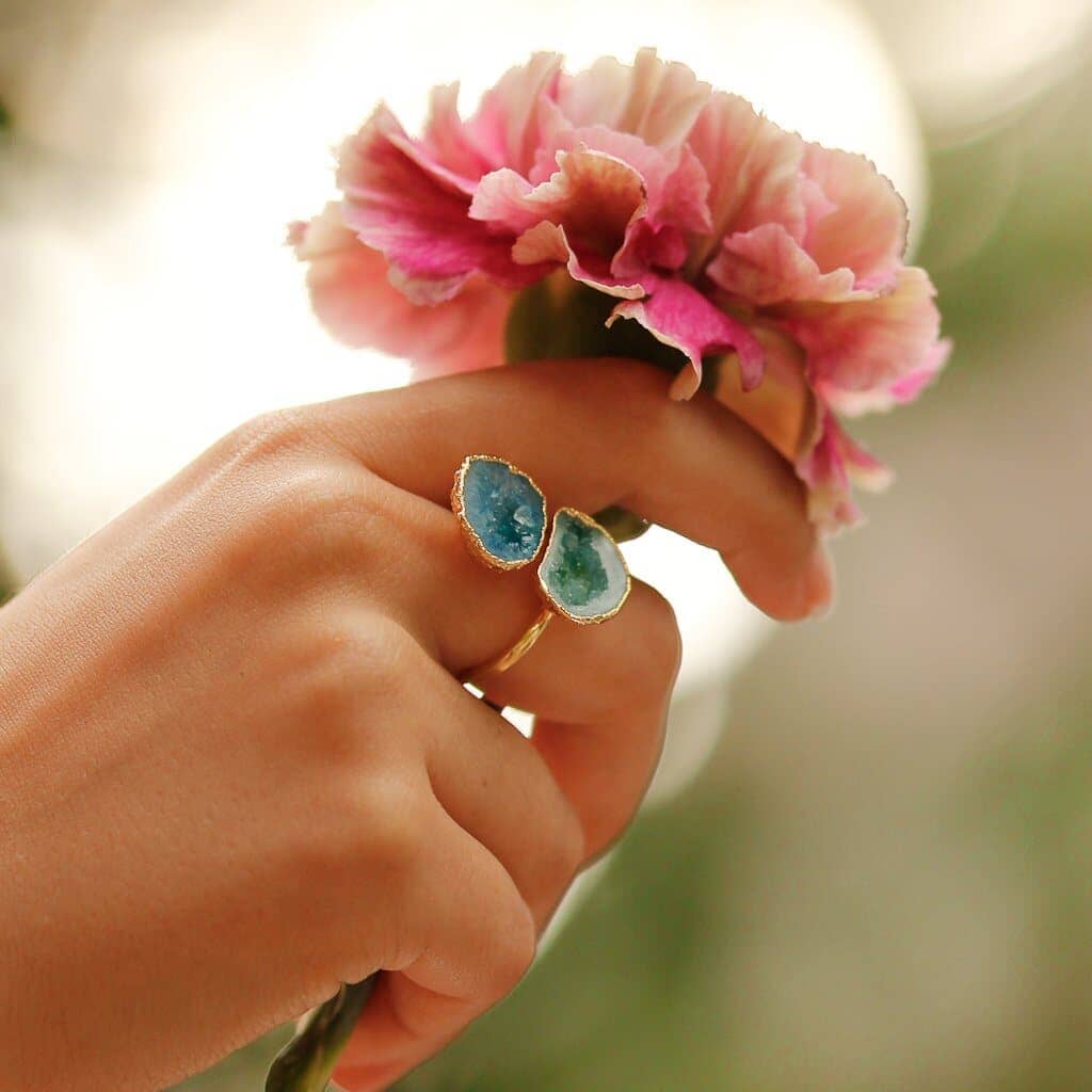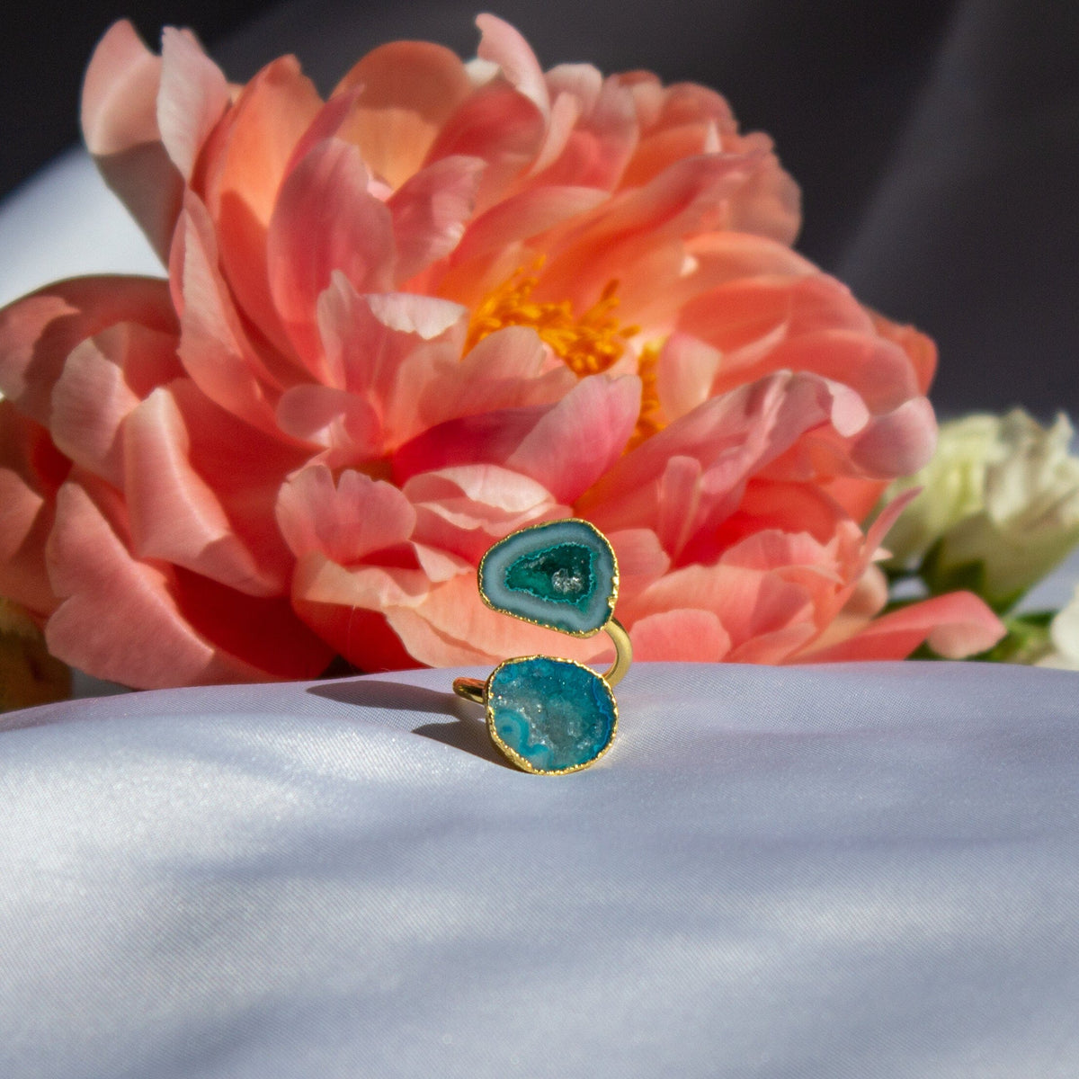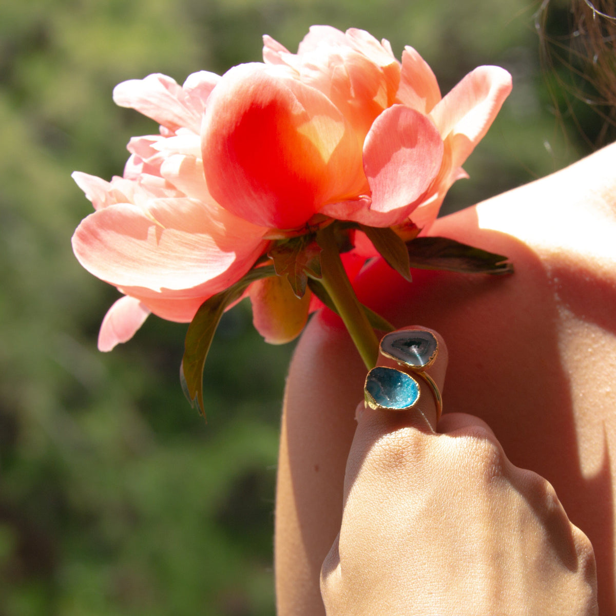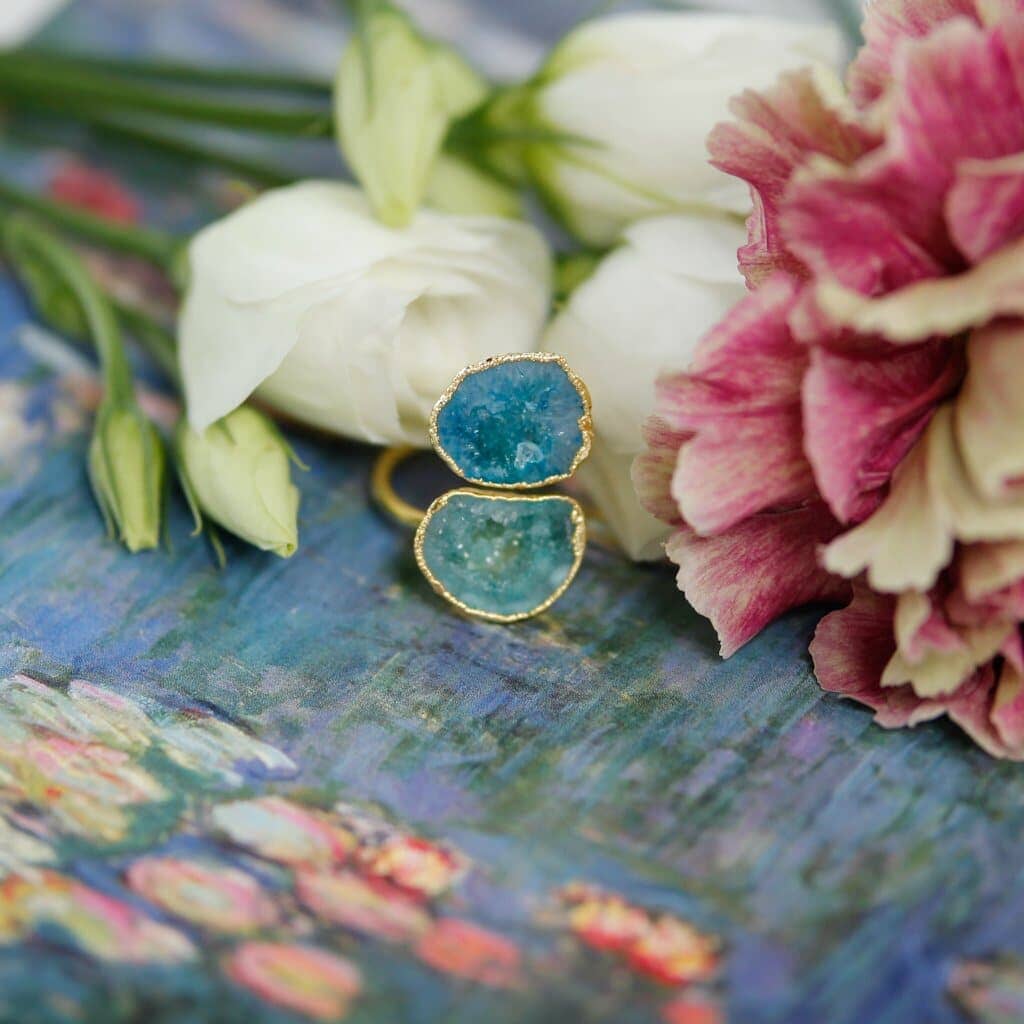 This Enchanting ring with glimmering geode stones captures the exuberant blue tones of Monet’s water lily pond. For the artist, his garden was an ‘outside studio’. At his home in Giverny, near Paris, he created a Japanese-style water garden. Water-lilies floating on this pond became the main subjects of his later paintings. Filling the canvas, the pond becomes a world in itself. Water-lilies gives us a sense of being immersed in nature.